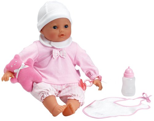Lila is dressed in a snuggly pink sleeper and comes with a matching cap, pacifier, feeding bottle, bib and soft teddy. Uses 3 "AAA" batteries (not included). Blue eyes. Measures 17" tall.